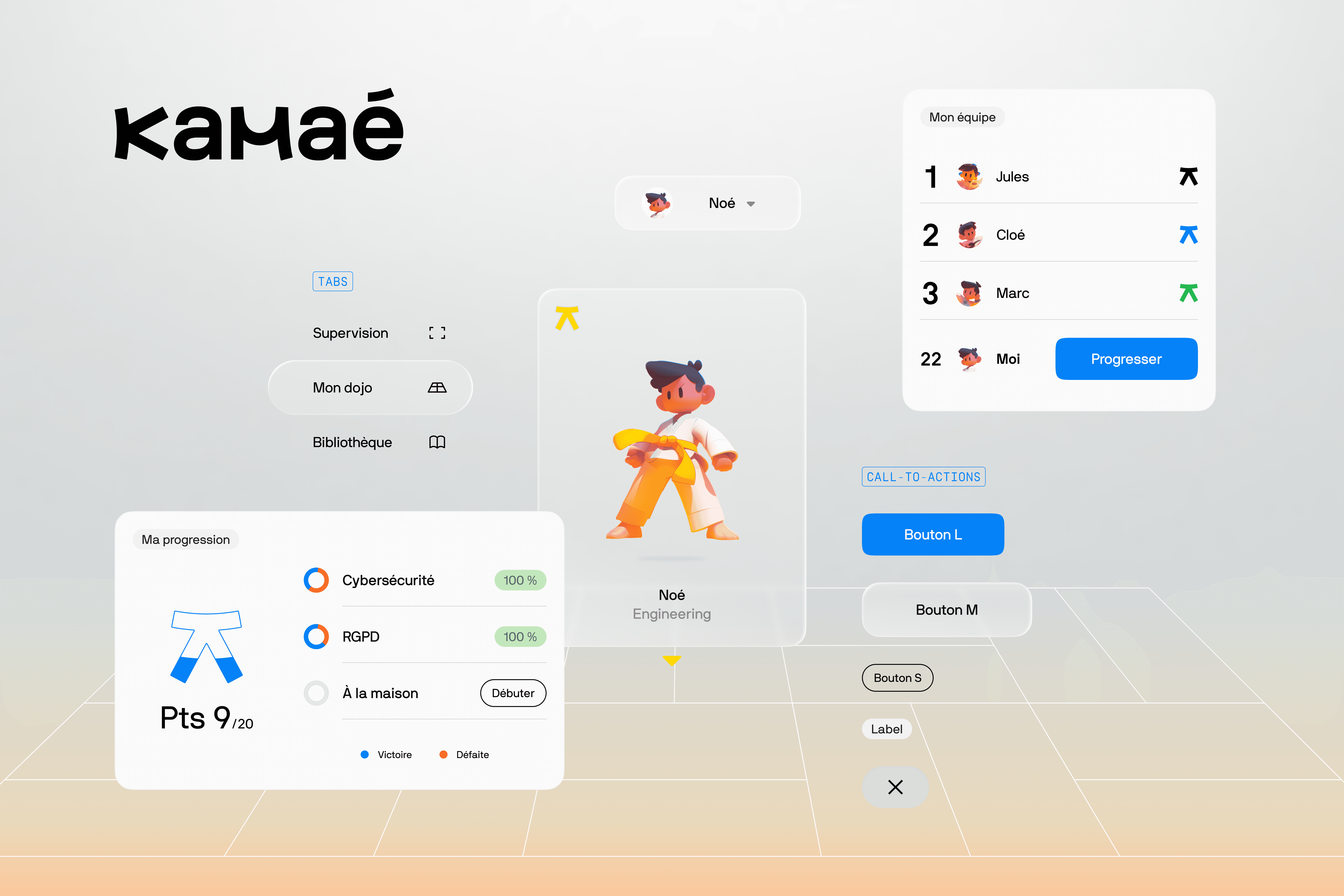 Un enjeu d’image, certes, mais dans l’univers impitoyable des start-up SaaS, branding et expérience ne font qu’un et ça, c’est notre plat préféré à la cantine. Tout commence avec une nouvelle posture avec notamment un ton de voix plus affirmé et impactant. Au cœur de l’expérience Kamaé nous avons repensé tout l’univers d’illustrations de la gamification, des paliers aux récompenses…