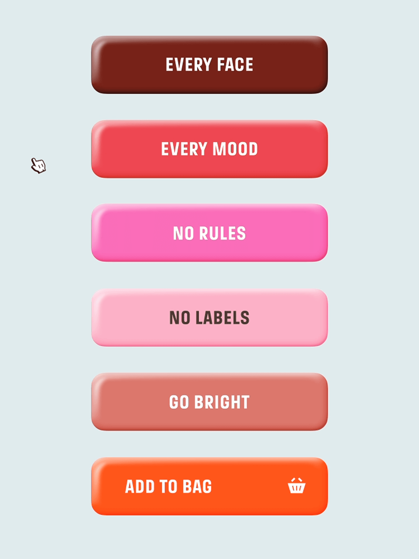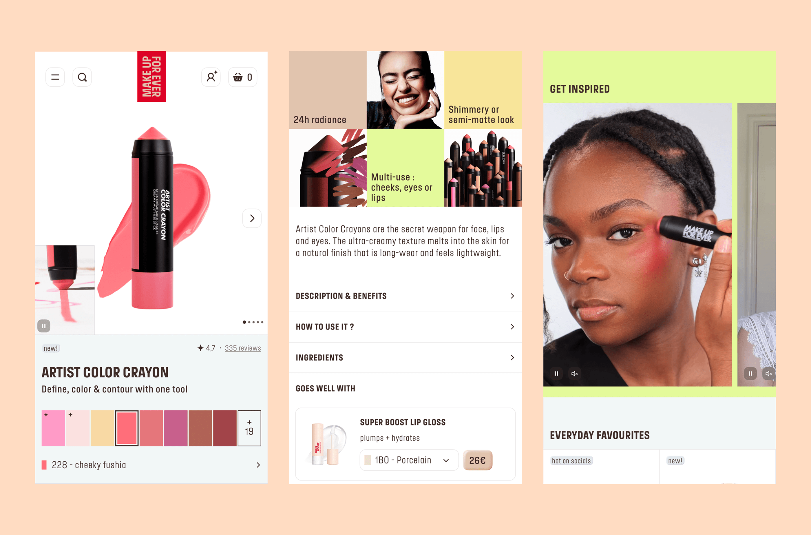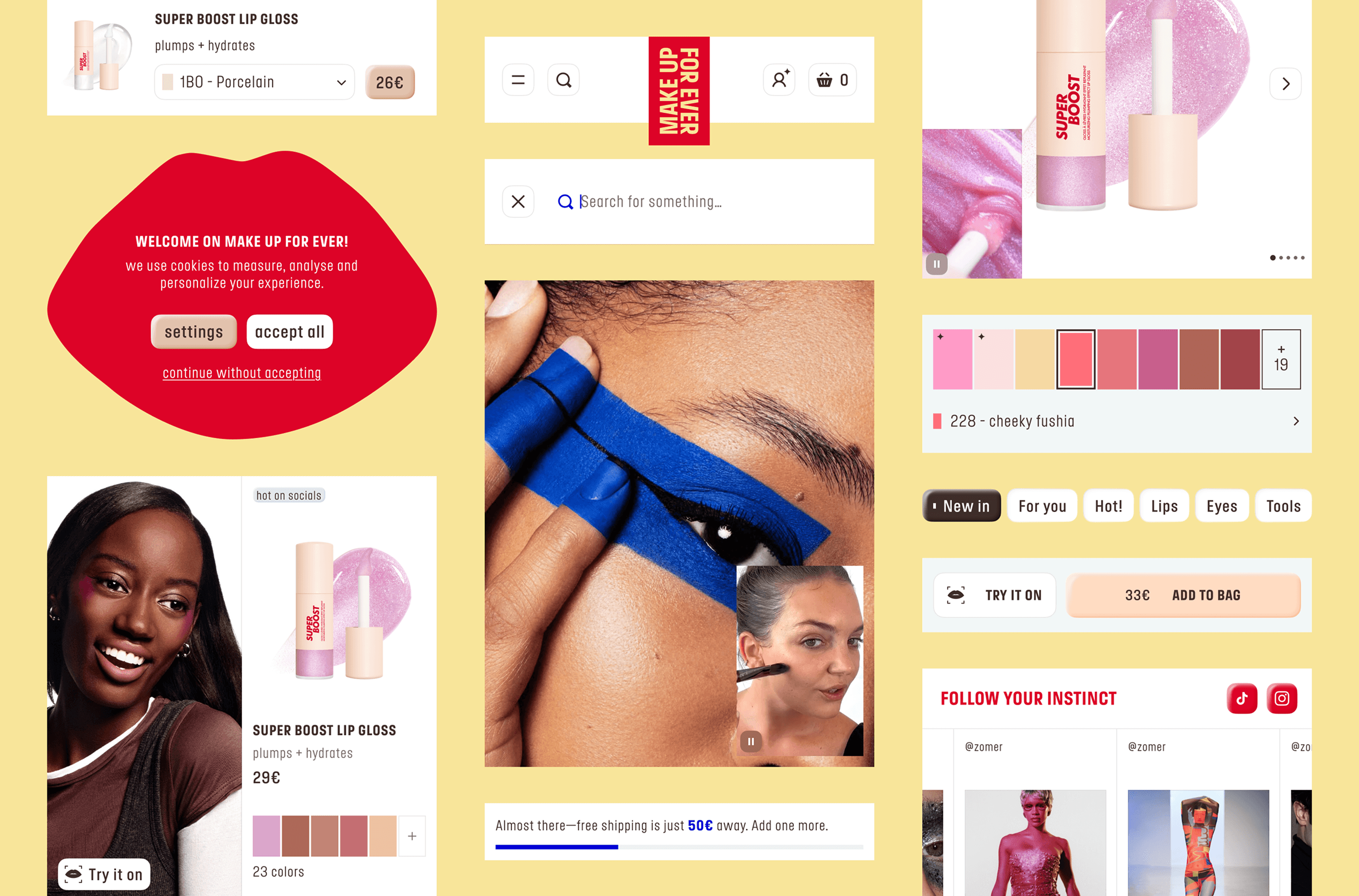 Nous interprétons le brandbook, encore tout frais, pour concevoir une interface qui s’affranchit des structures rigides du product design traditionnel. Puisqu’aucune mise en page classique ne pouvait contenir la force créative de la marque, nous avons laissé la matière dicter l’interface. Par exemple, nous utilisons des double frames, des stickers et des contours marqués pour casser la monotonie et exprimer la singularité de Make Up For Ever. La texture devient alors l’interface : le « gloss » et la poudre ne sont plus seulement des produits, mais des éléments graphiques vivants qui guident l’œil. Cet esprit « colorful » se niche jusque dans les moindres détails, à l’image des appels à l’action qui s’adaptent aux teintes choisies.