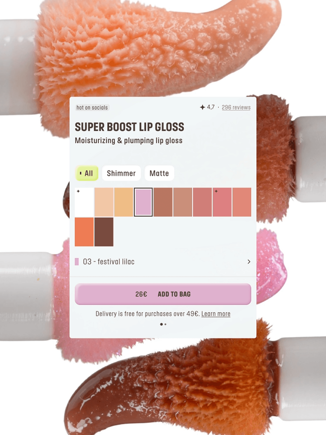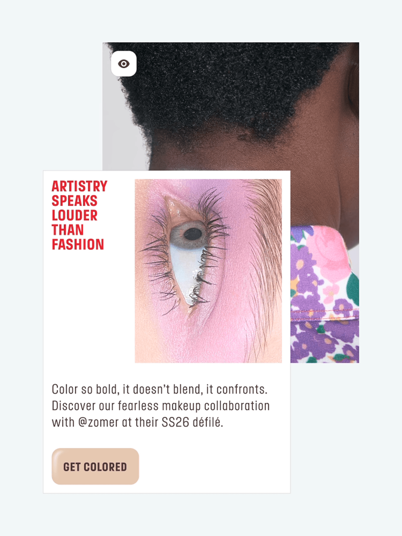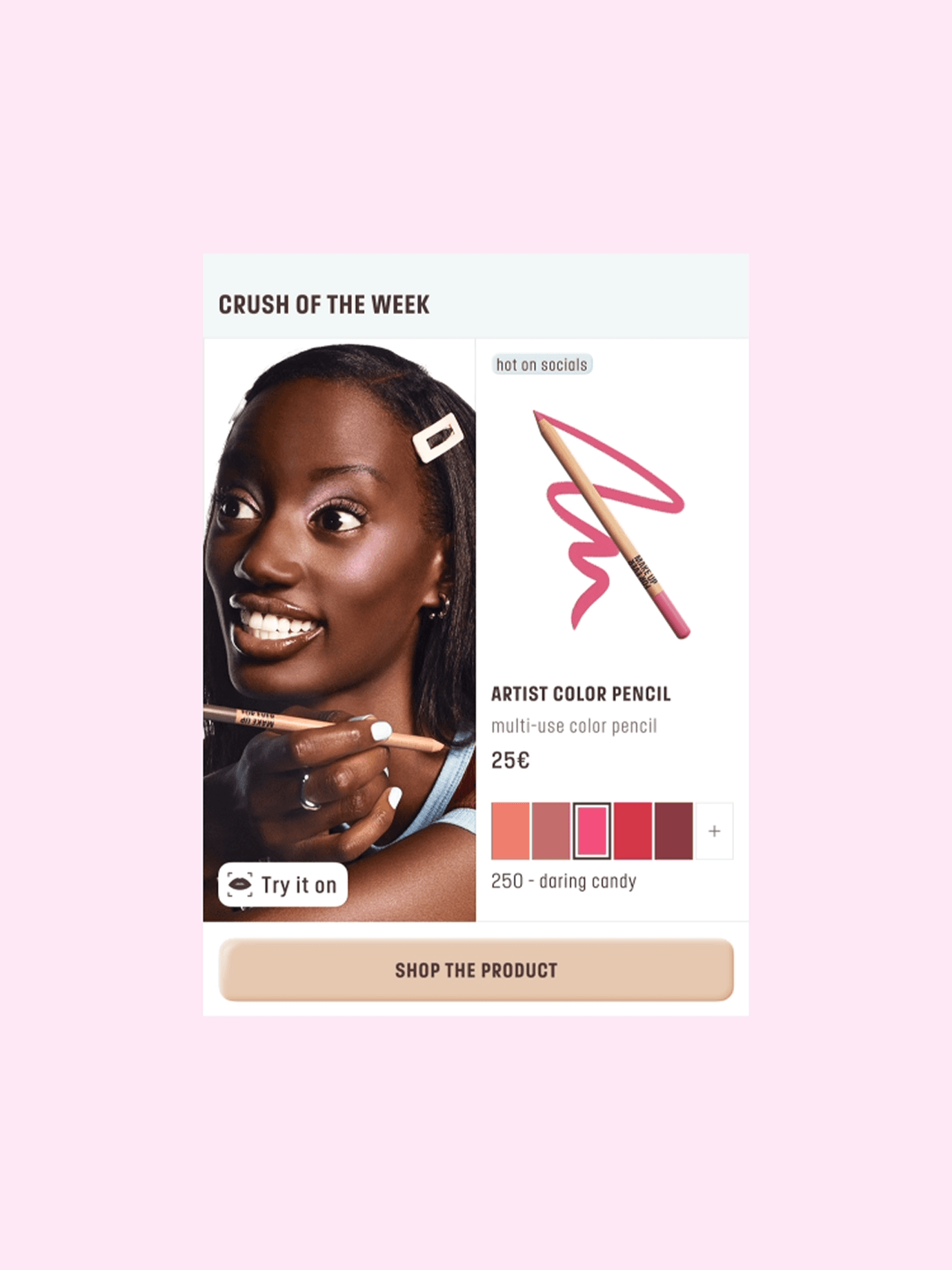 Nous interprétons le brandbook, encore tout frais, pour concevoir une interface qui s’affranchit des structures rigides du product design traditionnel. Puisqu’aucune mise en page classique ne pouvait contenir la force créative de la marque, nous avons laissé la matière dicter l’interface. Par exemple, nous utilisons des double frames, des stickers et des contours marqués pour casser la monotonie et exprimer la singularité de Make Up For Ever. La texture devient alors l’interface : le « gloss » et la poudre ne sont plus seulement des produits, mais des éléments graphiques vivants qui guident l’œil. Cet esprit « colorful » se niche jusque dans les moindres détails, à l’image des appels à l’action qui s’adaptent aux teintes choisies.