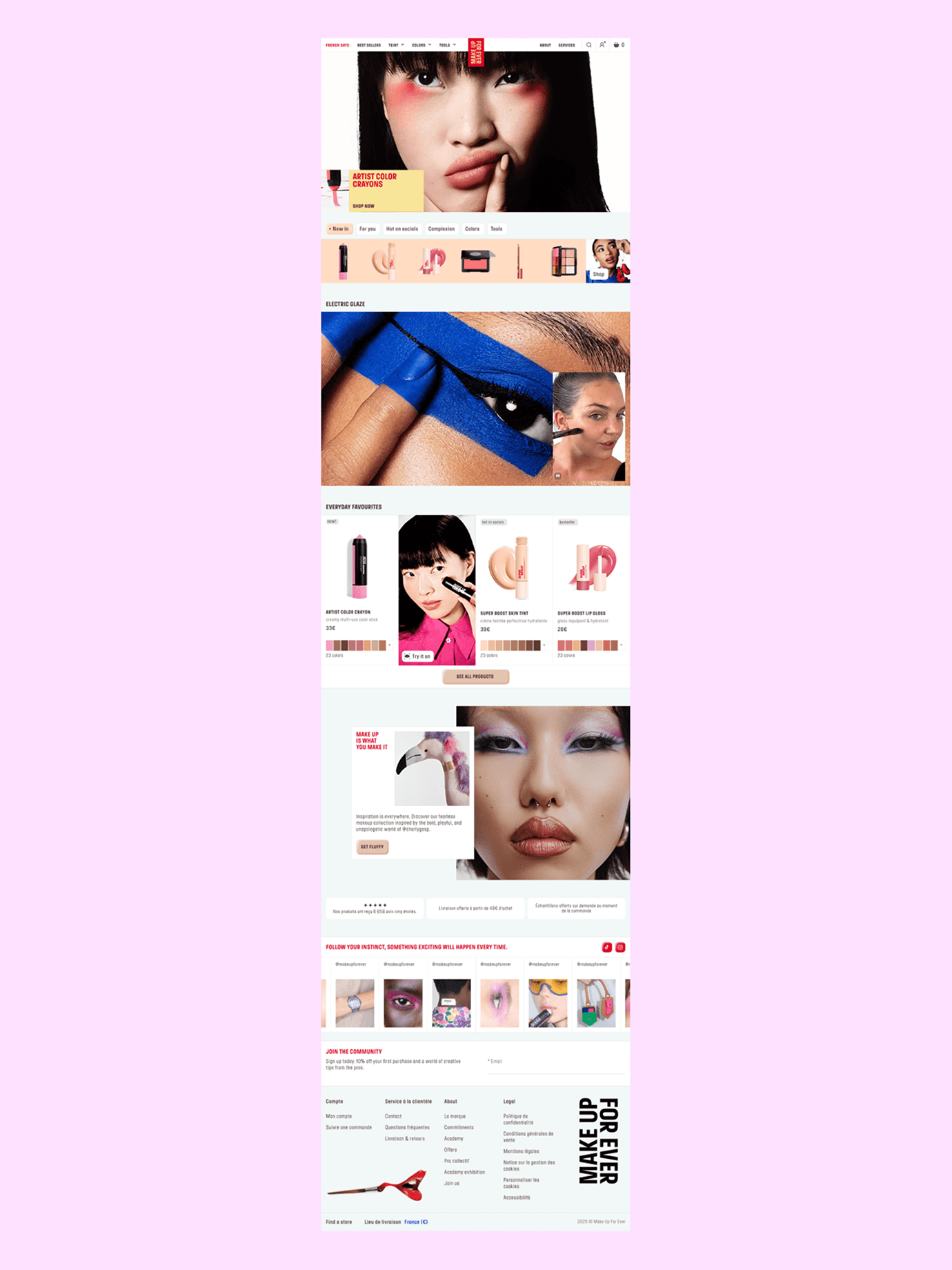 Le site se transforme ainsi en un lieu de transmission où le savoir-faire professionnel est mis au service de la communauté. Nous invitons les utilisateurs à explorer des horizons inattendus via des collaborations artistiques qui dépassent le monde du maquillage, mais aussi par des tutos de professionnels. Enfin, comme un hommage au mantra de la fondatrice de la marque, Dany Sanz, « Follow your instinct », nous valorisons notre communauté et notre univers avec un social wall dynamique.